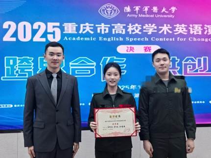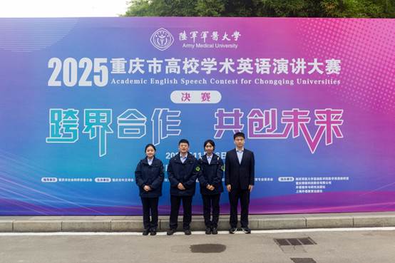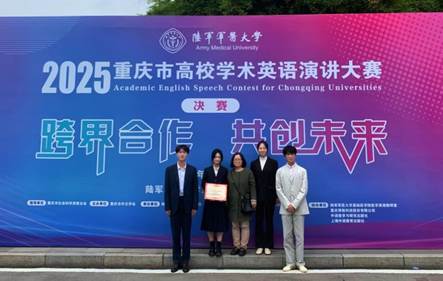 理科本科生组特等奖(陆军军医大学:胡新杰、朱婉灵、聂诗萍、蔡烨阳):这份荣誉凝聚着团队对学术表达的执着与并肩奋进的力量。感谢重庆市外文学会和学校搭建的优质平台,让我们得以锤炼跨学科思维与英语能力;感恩老师在选题、逻辑及语言上的悉心指导。比赛让我们深刻领悟到学术交流的价值,未来我们将以此为动力,深耕专业领域、提升跨学科沟通能力,在学术探索与国际视野拓展中砥砺前行,不负期许。