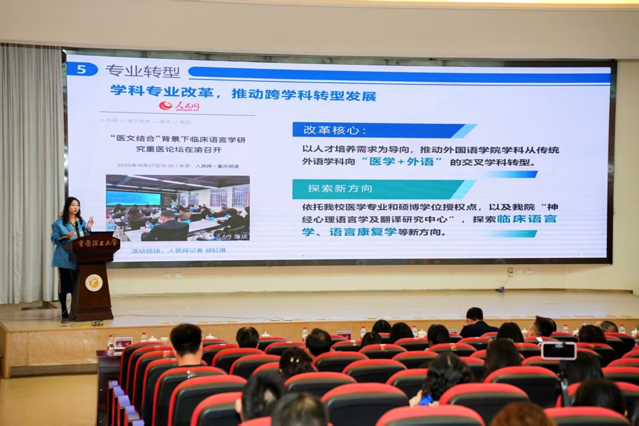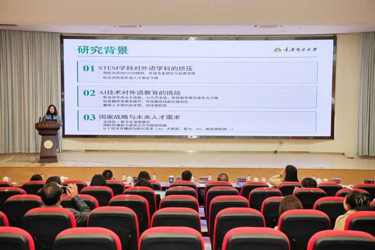 论坛设置8场主旨报告,涵盖外语教育多个核心领域。四川外国语大学刘玉梅教授基于新文科改革实践,提出新时代涉外人才培养体系;西南大学肖开容教授从文化认知视角构建翻译研究框架,助力提升跨文化传播有效性;重庆医科大学李佳颖译审分享了“医文融合‘六位一体’”培养路径,推动英语专业人才向医学外语复合型转型;重庆交通大学邱晋教授展示了AIGC技术在《英语视听说》课程中的创新应用,通过“师生共创”模式提升学生数字素养与口语能力。此外,重庆工商大学刘勇博士、重庆大学符存教授、重庆邮电大学王晶博士、重庆理工大学李淑晶博士分别从中匈本科生批判性思维比较、留学生国际传播实践、“翻译+技术+传播”MTI人才培养、越南媒体话语与国家形象等角度展开交流,为外语教育与国际传播研究提供了多元视角。